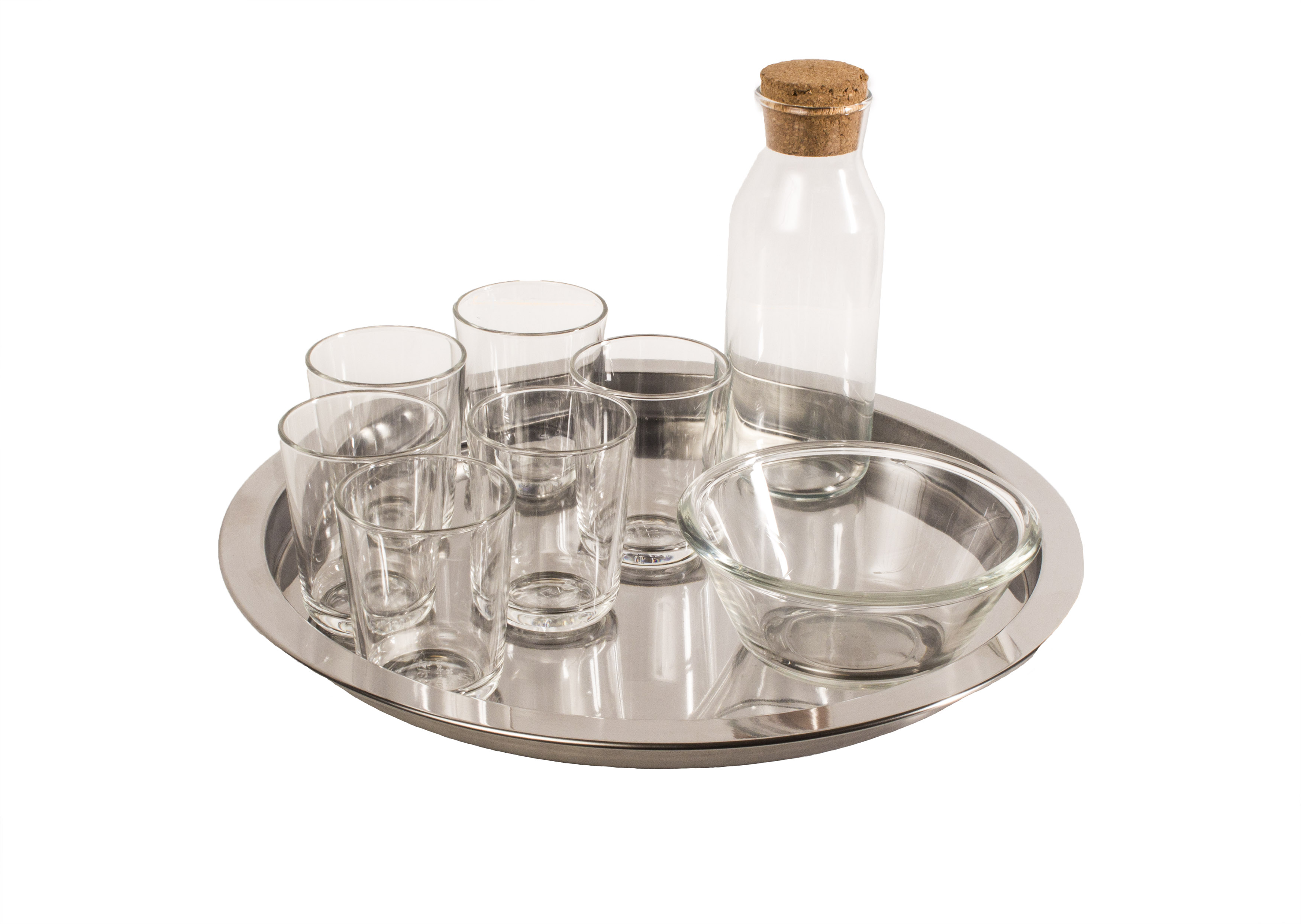 Serveringsset för kundrum. Bestående av serveringsbricka, glasskål, glaskaraff och 6 stycken glas. Varje del kan även beställas separat.