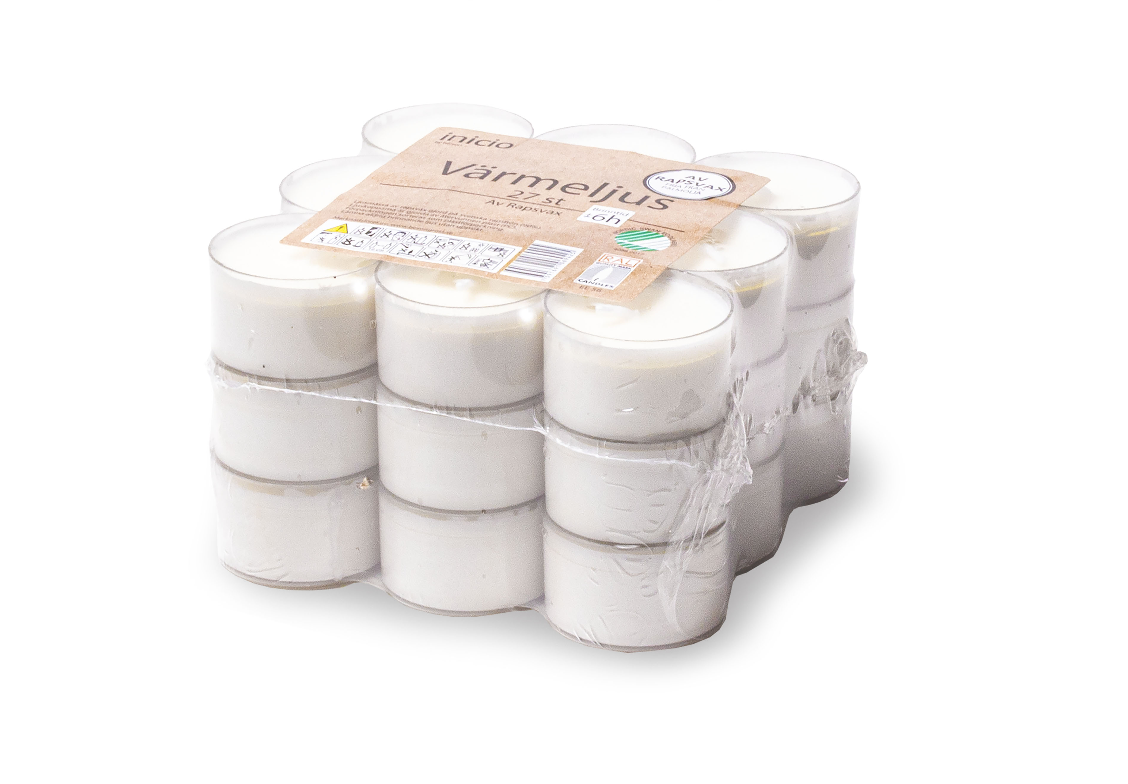 Miljövänliga, Svanenmärkta värmeljus av hög kvalité med transparent kopp. 6 timmars brinntid. Tillverkade av rapsvax och innehåller inte palmolja eller animaliskt fett. Levereras 27/fpk.